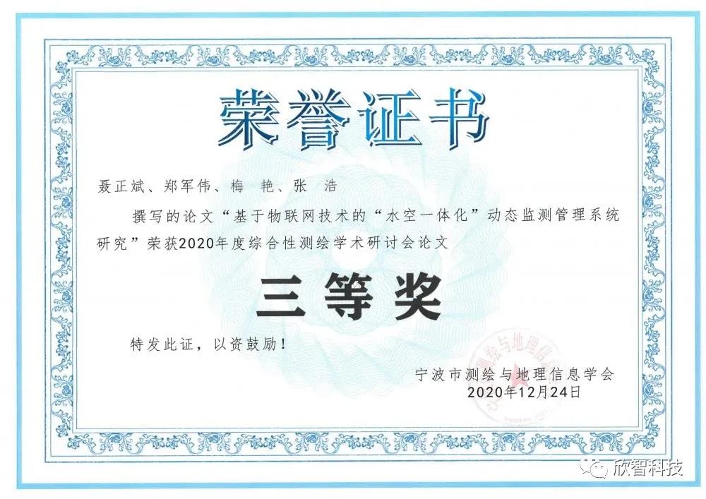 我公司注重理论与实践相结合,技术人员每年都撰写并发表多篇学术论文,其中《基于物联网技术的“水空一体化”动态监测管理系统研究》一文荣获宁波市2020年度综合性测绘学术研讨会论文“三等奖”。该论文从河湖管理的需求出发,分析了当前水利、环保部门在管理中信息资源不足和共享困难的原因,阐述了基于物联网技术开发的“水空一体化”动态监测管理系统组成及优势,为河道的精细化管理搭建一个公共的智慧平台,促进了各个管理部门之间的共建共治共享,实现了水利的精细化、信息化、全域化管理,为构建“人水和谐”的生态环境提供了一套完整的解决方案。